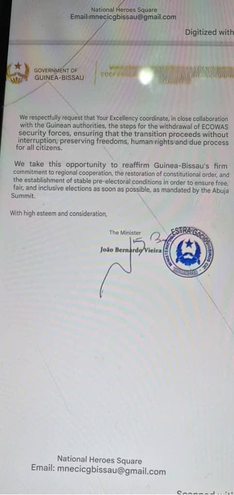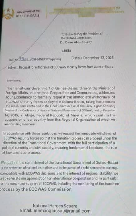 In an official correspondence dated 22nd December and addressed to the President of the ECOWAS Commission, Dr Omar Touray, the Gen. Horta Inta-A-led junta “…formally request the immediate withdrawal of the ECOWAS security forces deployed to Guinea-Bissau, taking into account the resolutions contained in the Final Communique of the 68th Ordinary Session,” of the ECOWAS leaders.