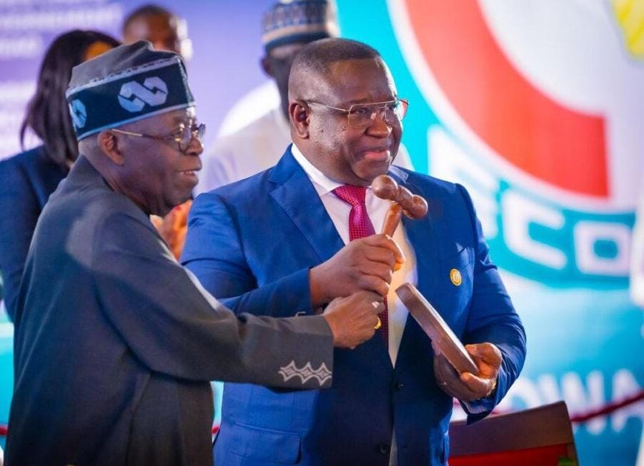 Nigerian President Bola Tinubu handing the rotational mantle of ECOWAS leadership to Bio in 2025