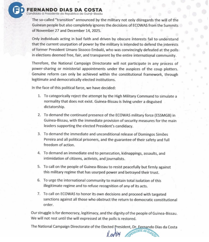 Dr Fernando Dias da Costa, who claimed victory in Guinea-Bissau’s 23rd November 2025 presidential election, will not participate in the power-sharing transition government suggested by the ruling military junta, and has instead called for his inauguration as the country’s legitimate leader, his National Campaign Directorate said.