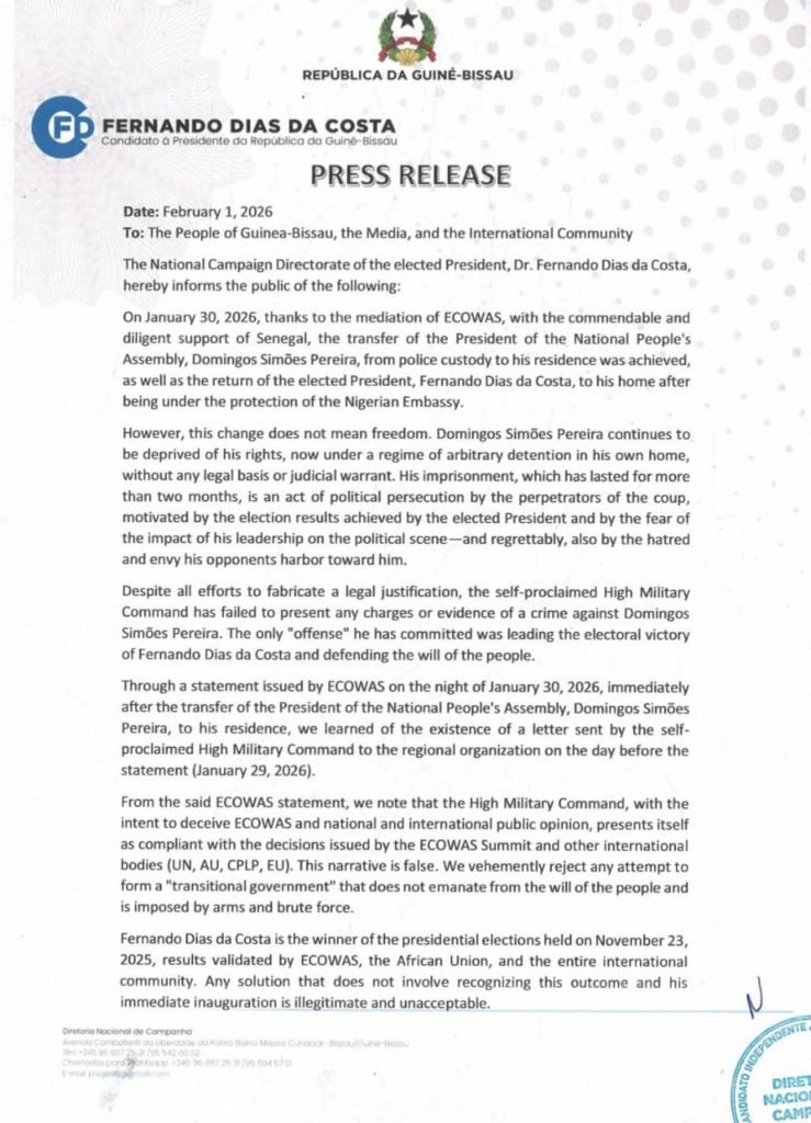 In its statement, the Dias Campaign Directorate confirmed that Senegal has facilitated the “transfer of the President of the National People’s Assembly, Mr. Domingos Simões Pereira, from a police station to his private residence,” while “the duly elected President, Fernando Dias da Costa, was able to return to his home after staying under protection at the Embassy of the Federal Republic of Nigeria.”