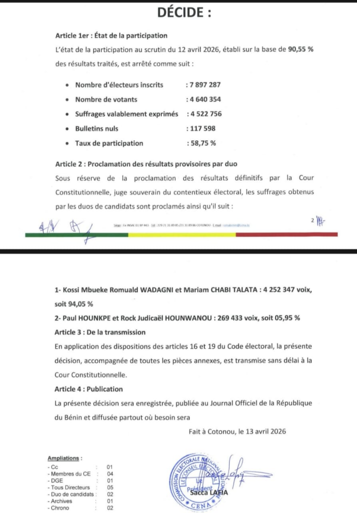 The Benin National Autonomous Election Commission, CENA, has declared Kossi Mbueke Romuald, 49, the ruling Coalition’s candidate and Finance Minister for the past 10 years, winner of the 12 April 2026 presidential election with 94.05% of the vote.